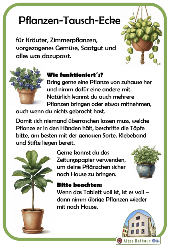 Mit dem Frühling beginnt auch wieder die Zeit der Gartenfreunde. Oft werden zuhause auf der Fensterbank mehr Pflanzen vorgezogen, als später im Garten Platz finden – während andere Sorten vielleicht gar nicht so gut gelungen sind. Dafür gibt es nun eine einfache Lösung: das Pflanzentauschbrett im Alten Rathaus. Es befindet sich auf dem Fensterbrett direkt neben der Eingangstür. Bringen Sie gerne überschüssige Pflänzchen (im Topf) vorbei und nehmen Sie sich im Gegenzug andere mit. Erreichbar ist das Pflanzentauschbrett immer, wenn auch das Alte Rathaus geöffnet ist – zu den Bürozeiten am Dienstag Nachmittag von 14.00-17.00 Uhr und donnerstags von 9.30-13.30 Uhr (außer am Di, 7.4. wegen Urlaub) sowie während der verschiedenen Angebote.